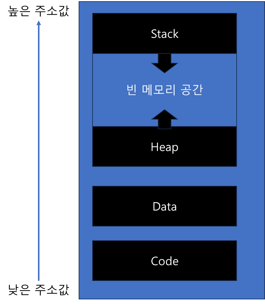 프로세스 메모리 구조는 코드(Code), 데이터(Data), 스택(Stack), 힙(Heap) 영역으로 구성된다. 각 영역은 프로세스의 실행에 필요한 데이터를 저장하고 관리하는 역할을 한다.